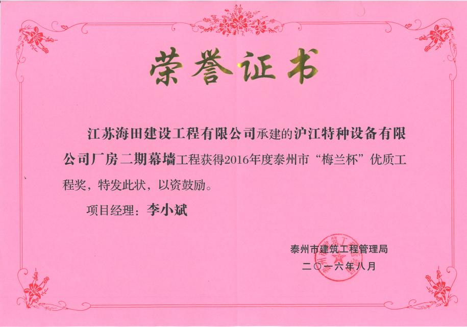 熱烈祝賀我公司承建的滬江特種設(shè)備有限公司廠房二期幕墻工程獲得2016年度泰州市“梅蘭杯”優(yōu)質(zhì)工程獎